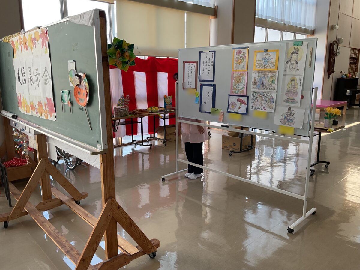 ご利用者様が日々の手工芸活動等で作り上げた作品を並べて展示会を開催いたしました。