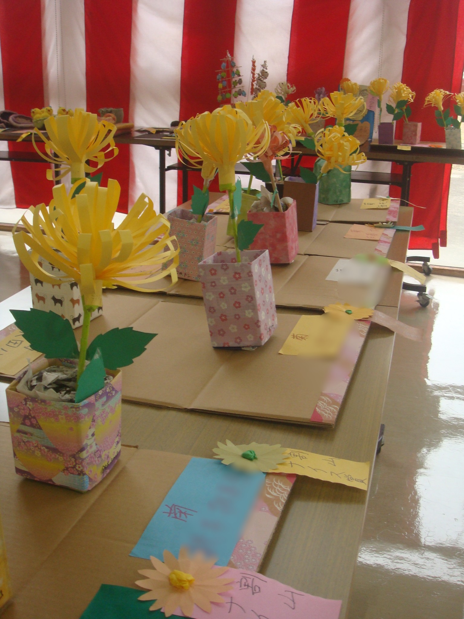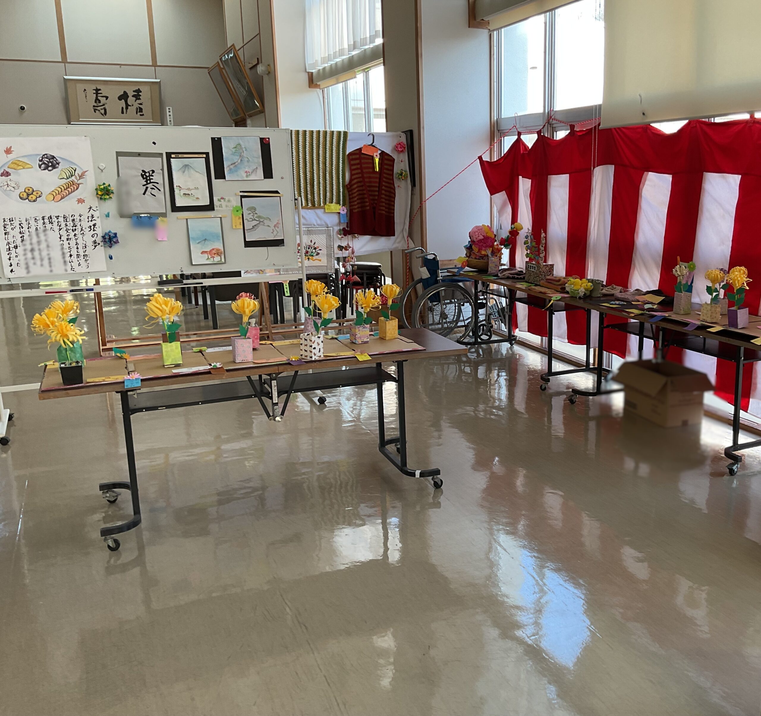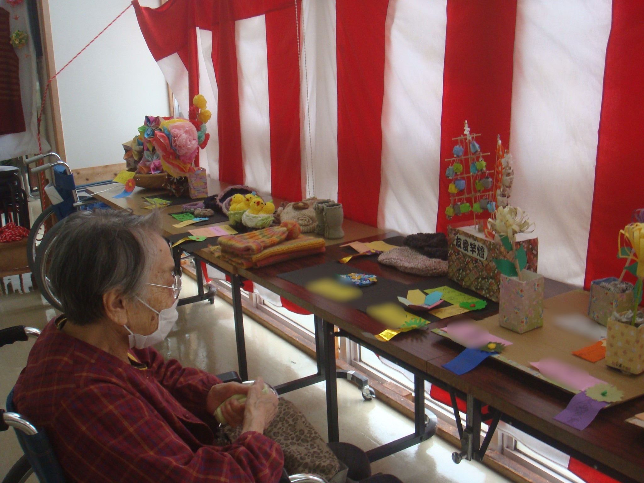 ご利用者様が日々の手工芸活動等で作り上げた作品を並べて展示会を開催いたしました。