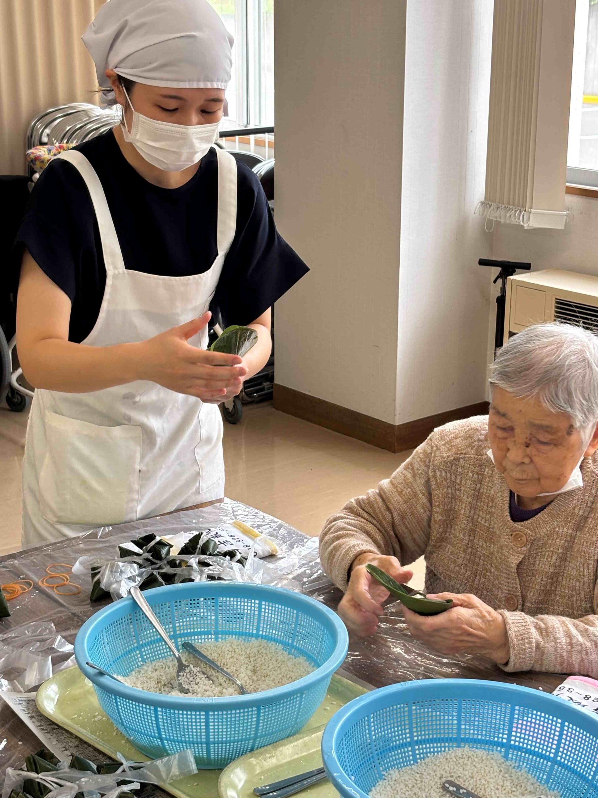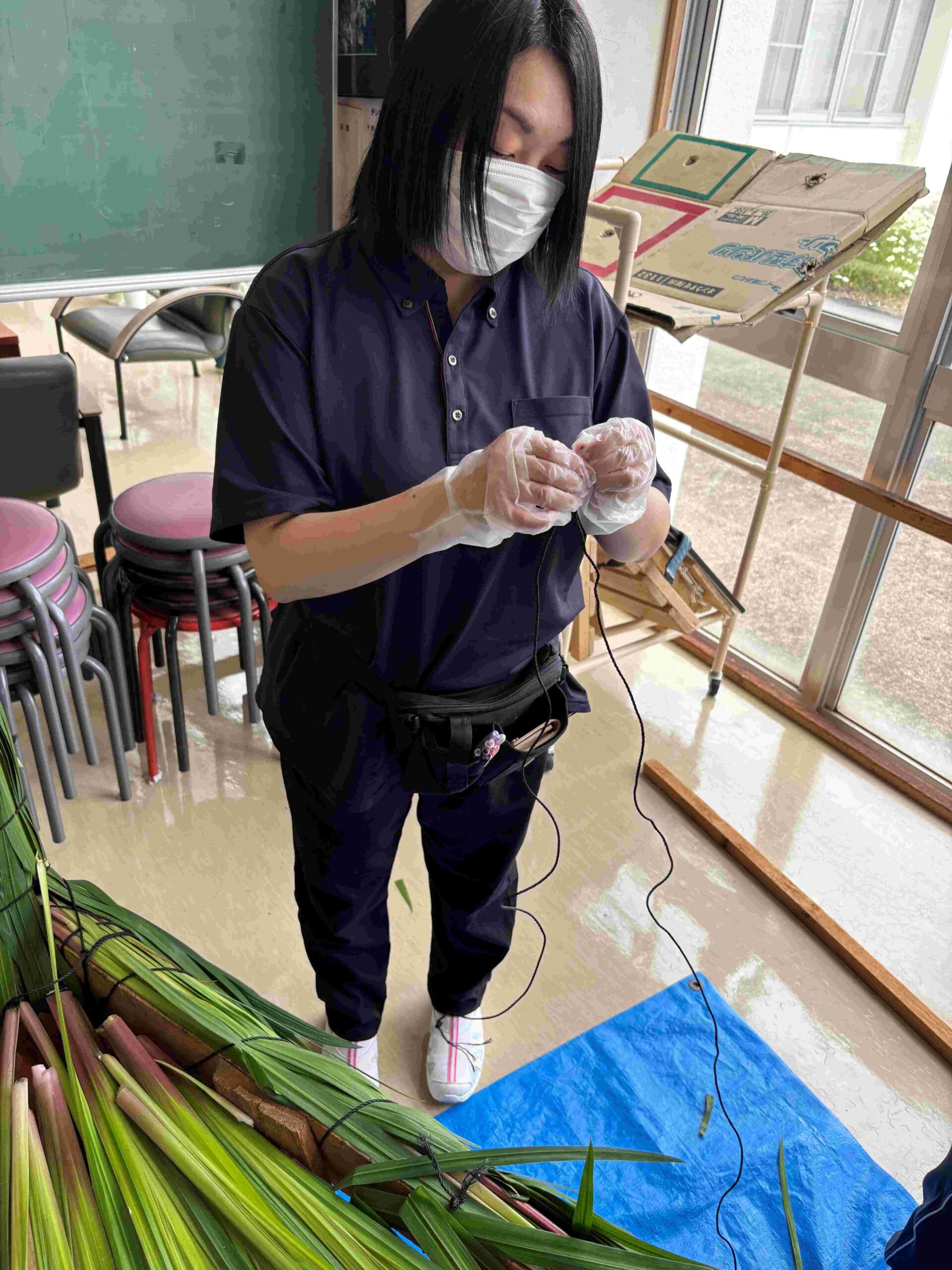 もち米を笹に包む作業を行いますが、茹でる時に崩れないようにする巻き方が非常に難しいです。